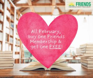 February is Library Lovers Month! You will be contacted within 2 weeks of purchase to provide additional information for your free gift membership. Membership renewals AND new memberships purchased through the Friends website are both eligible for this limited-time deal. The free membership must be of equal or lesser value than the purchased membership.